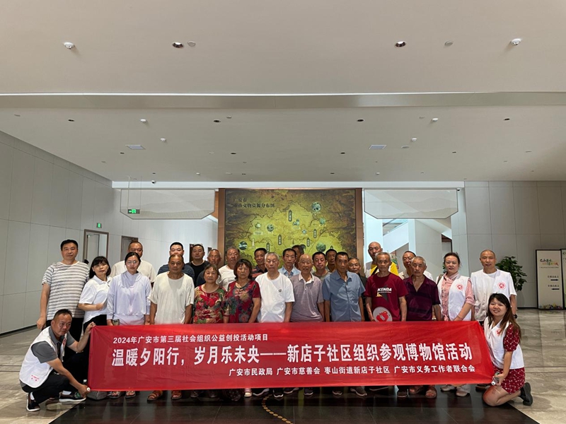为了丰富社区老年人的精神文化生活,增进他们对历史文化的了解与热爱,2025年6月13日在广安市民政局的大力支持下,由广安市慈善会、新店子社区、广安市义务工作者联合会联合成功举办夕温暖夕阳行,岁月乐未央——新店子社区组织参观博物馆活动,本次活动共计30余人参与。
