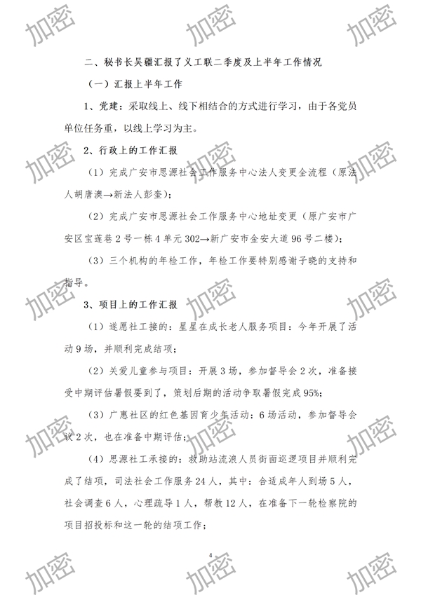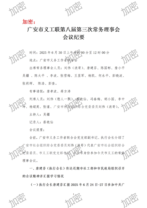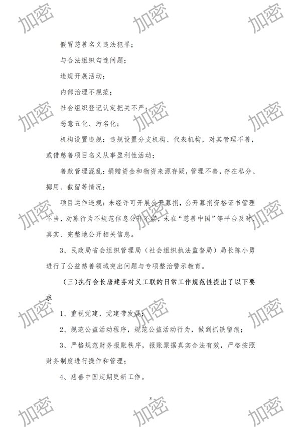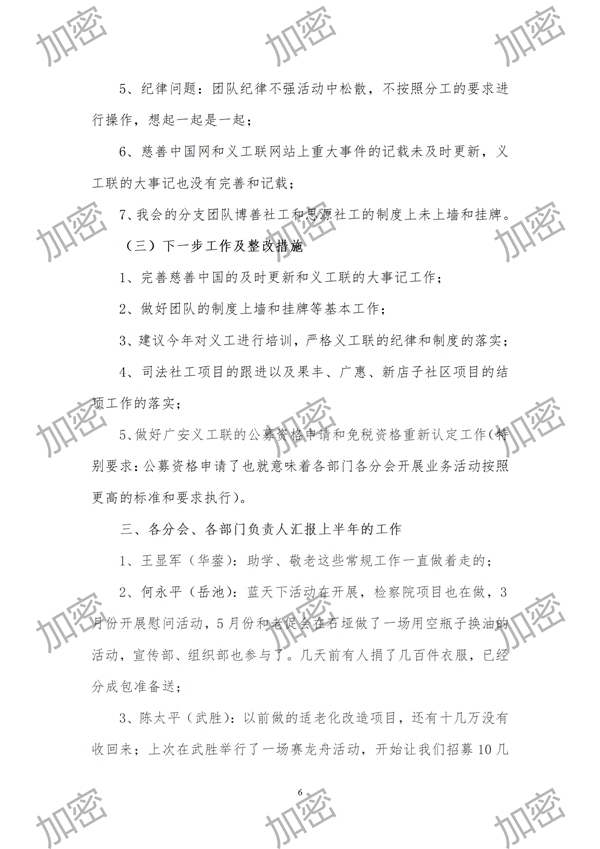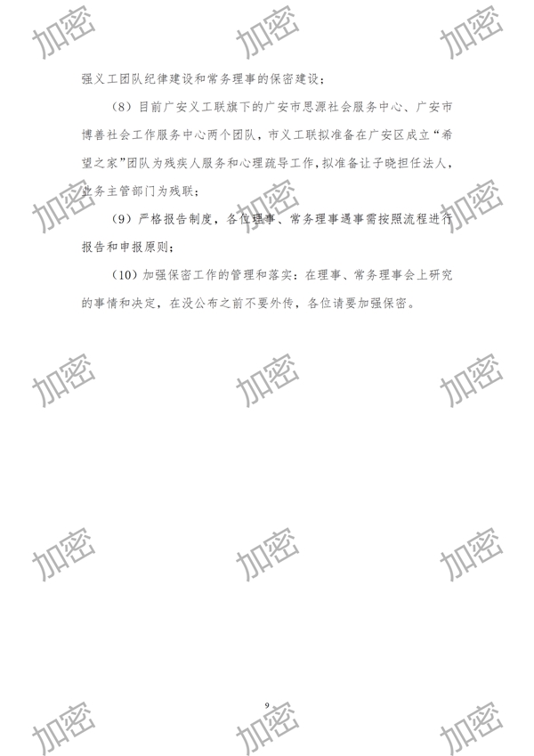 (10)加强保密工作的管理和落实:在理事、常务理事会上研究的事情和决定,在没公布之前不要外传,各位请要加强保密。