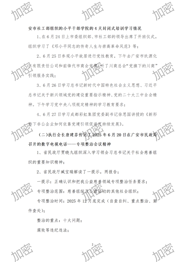(一)执行会长唐建芬汇报2025年6月24日-27日参加中共广安市社工部组织的小平干部学院的4天封闭式培训学习情况